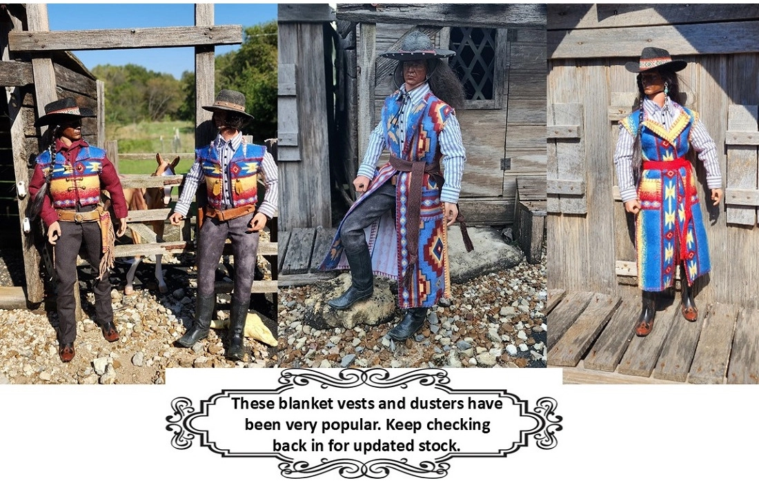 Welcome to my dress shop! I sew custom handmade clothing for 1/6 scale action figures. Many of the outfits can be made for Gabriel or Mego as well. I sew for 1/6 scale female figures like Cy girl, perfect body, BBI, Dragon, Otaku and Marx Jane West. I do sew for the male figures Dragon, BBi, G.I. Joe, Marx Johnny West and Knights, as well as many other brands.