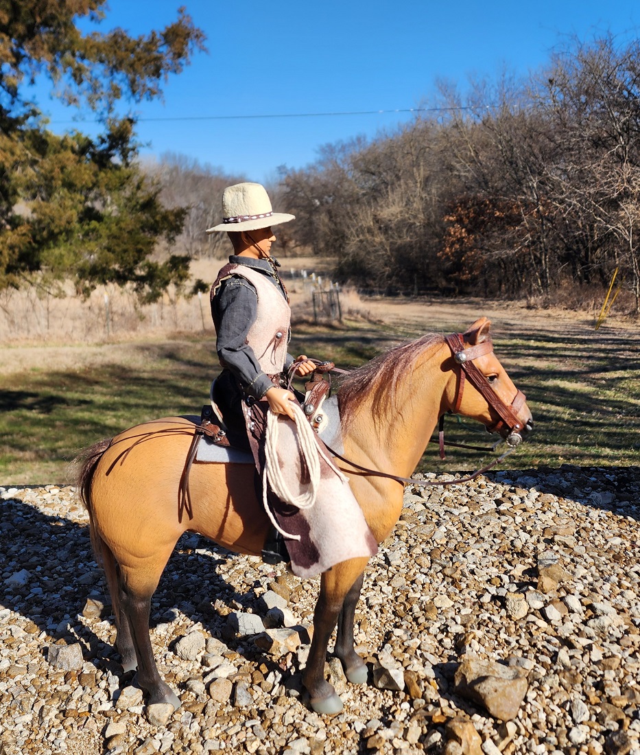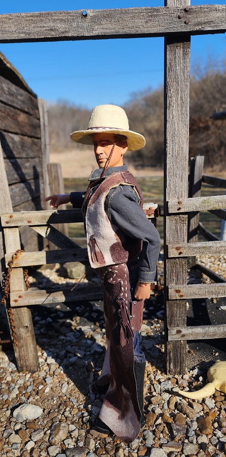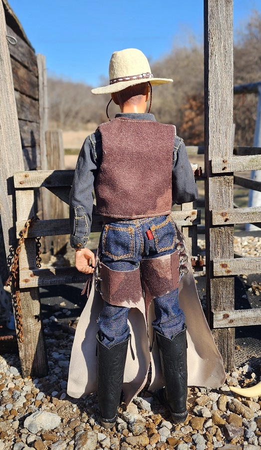 Put your figure’s pants into the chaps, and then put them onto your figure. There is a buckle on the chaps in the back side, which you buckle up after you get the shirt tucked into the pants.