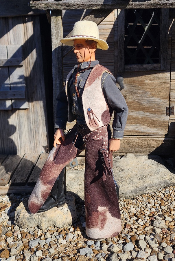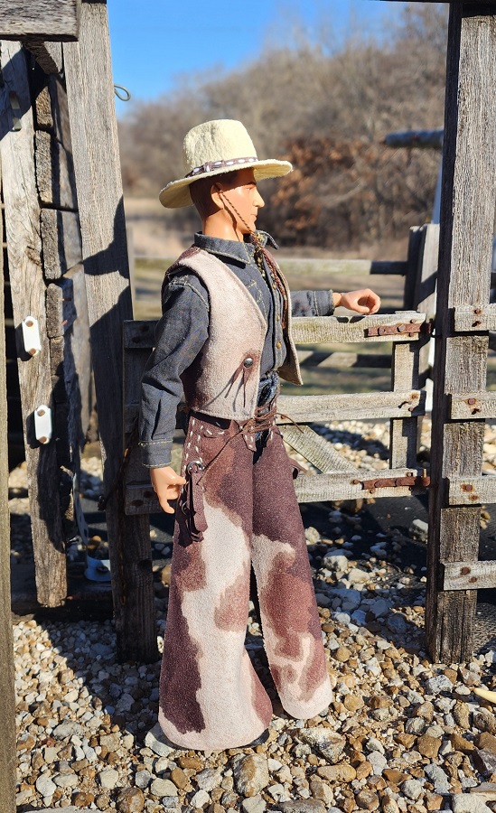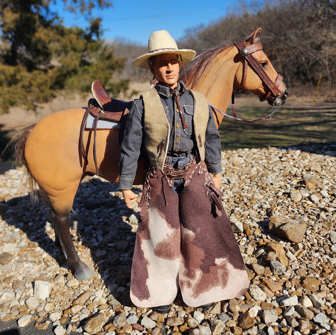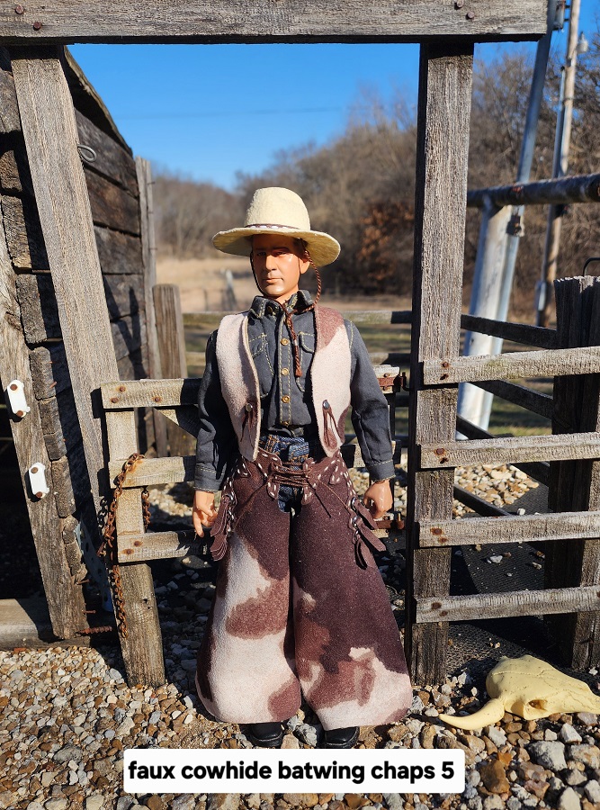 These 1/6 scale chaps are made with real fake cowhide and real leather yokes that are hand stitched. They have snaps in the back. They are Batwing style.
