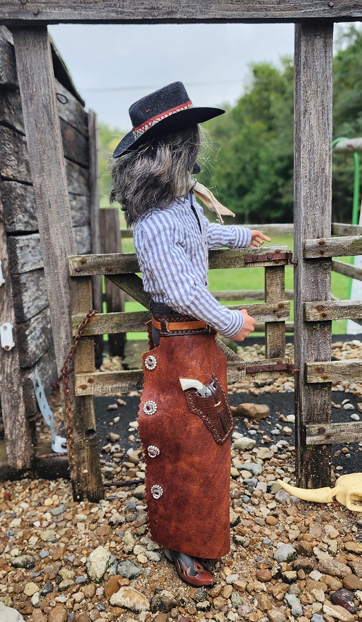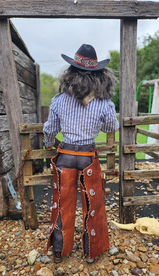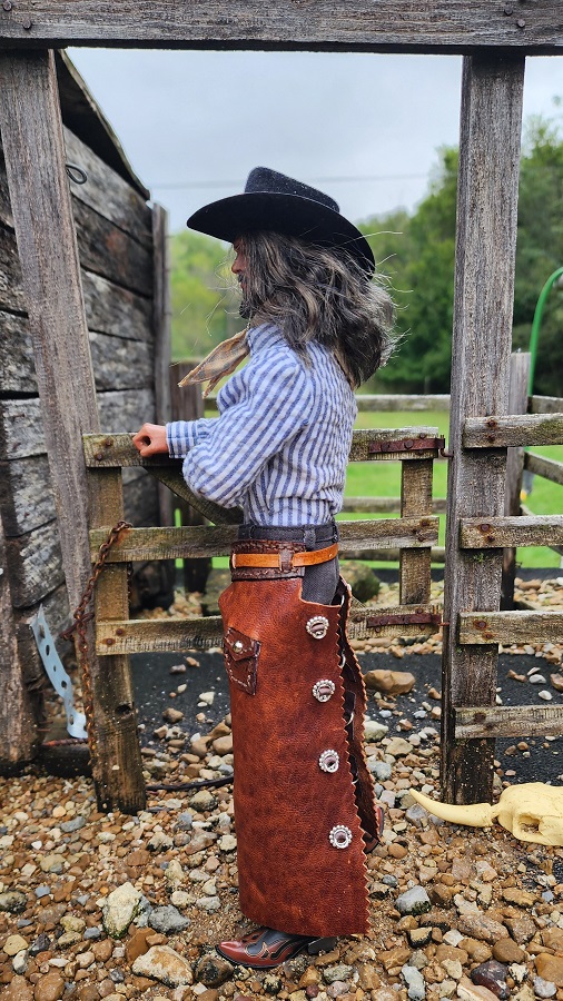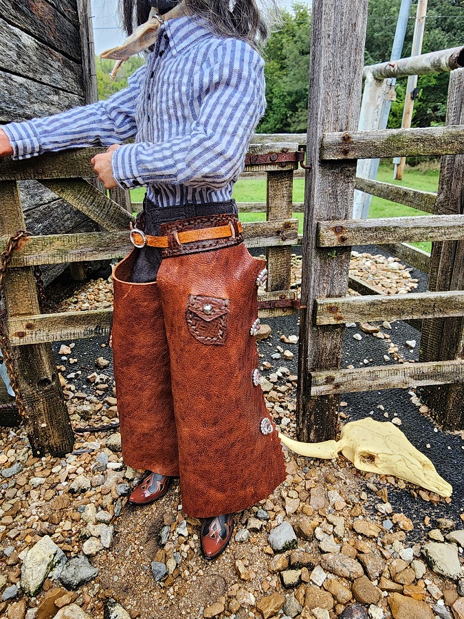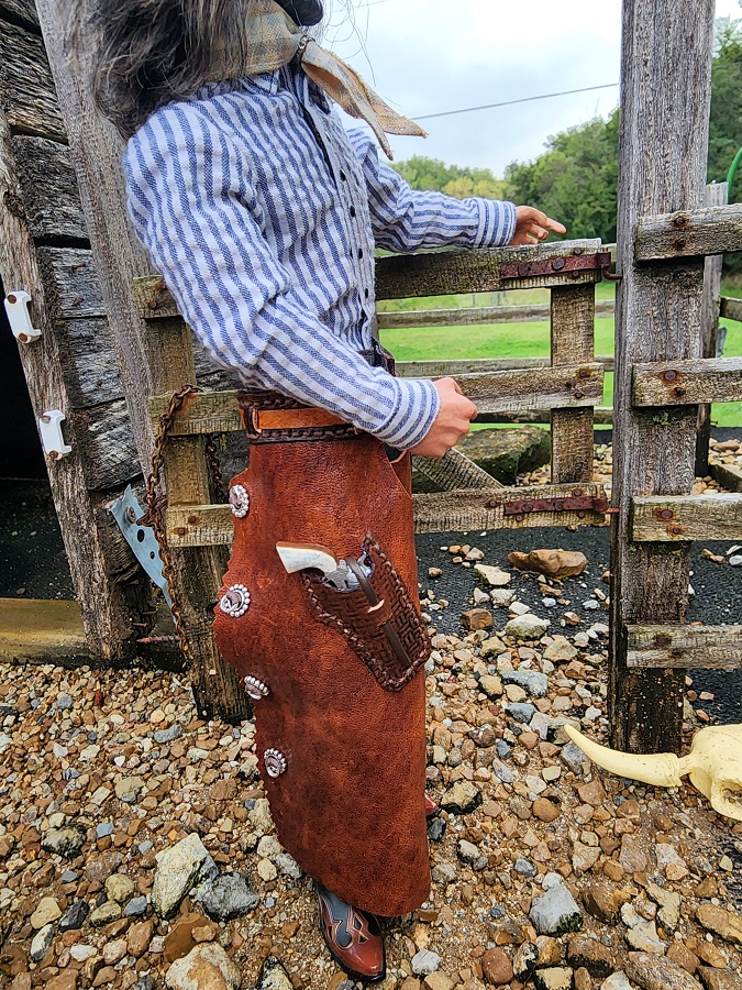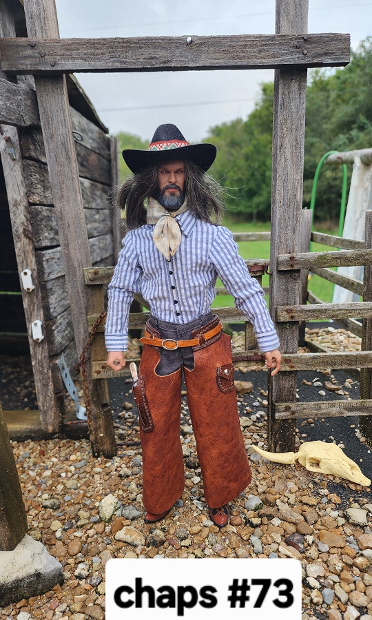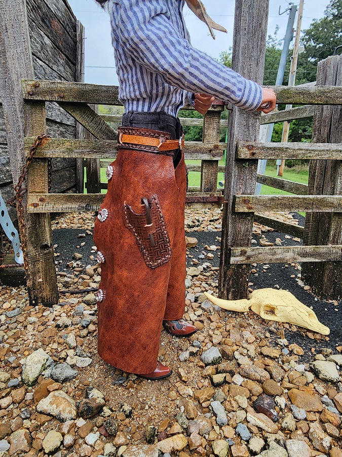 These 1/6 scale chaps are made from real leather, and are hand stitched. They have an added detail of a gun holster. The gun is NOT included. The chaps are closed with hooks, and are a good fit for figures with big thighs.