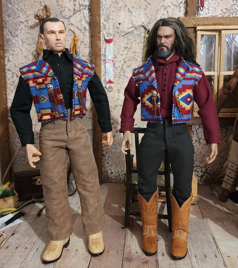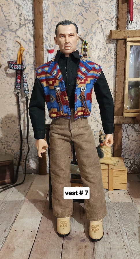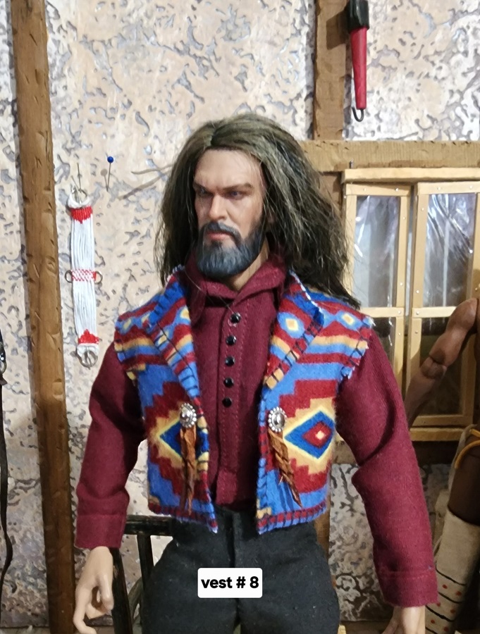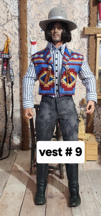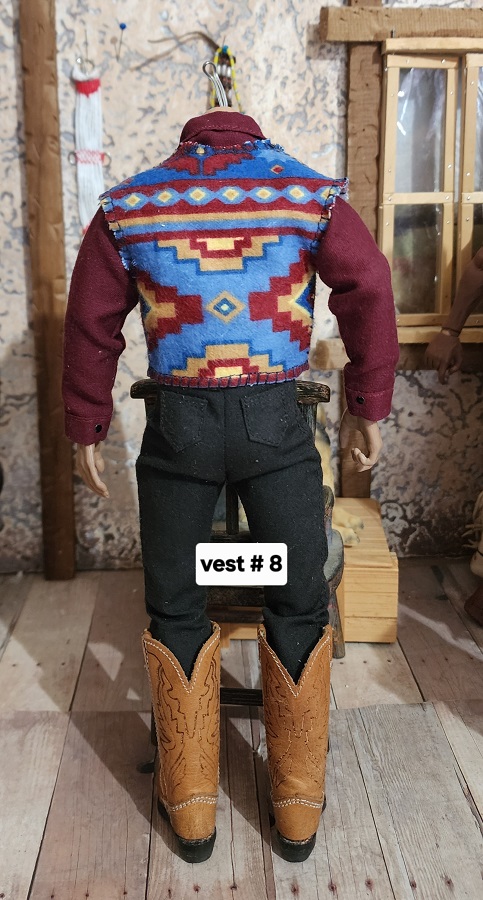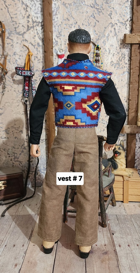 These 1/6 scale rustic blanket vests are made with flannel. They are the same pattern, but placement is a little different. The silver conchos and leather strings are the same them. This is the last batch of these rustic blanket vests. I used up all the fabric.