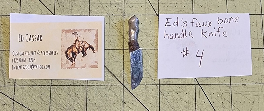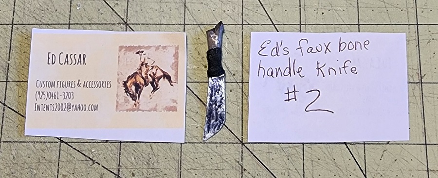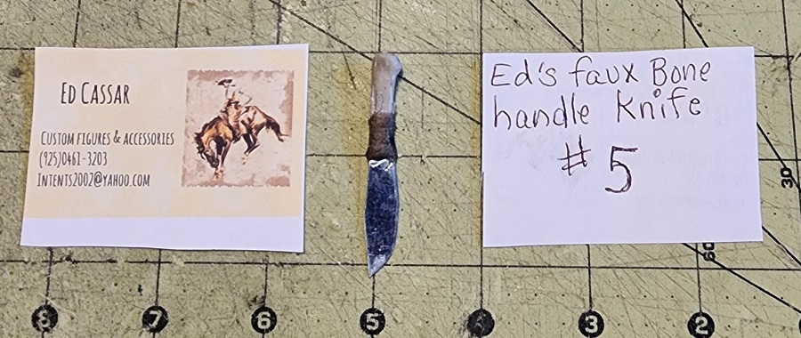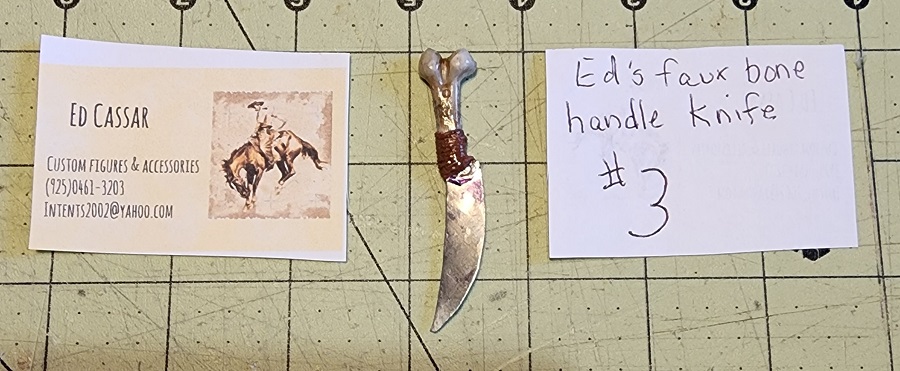 These 1/6 knives are hand made by Ed Cassar. He used faux bone for the handles and the blades are real metal. These are for adult collectors as they are sharp! They will work for many eras. Native American, scout, frontier man, mountain man, and medieval fantasy figures!