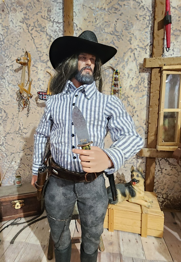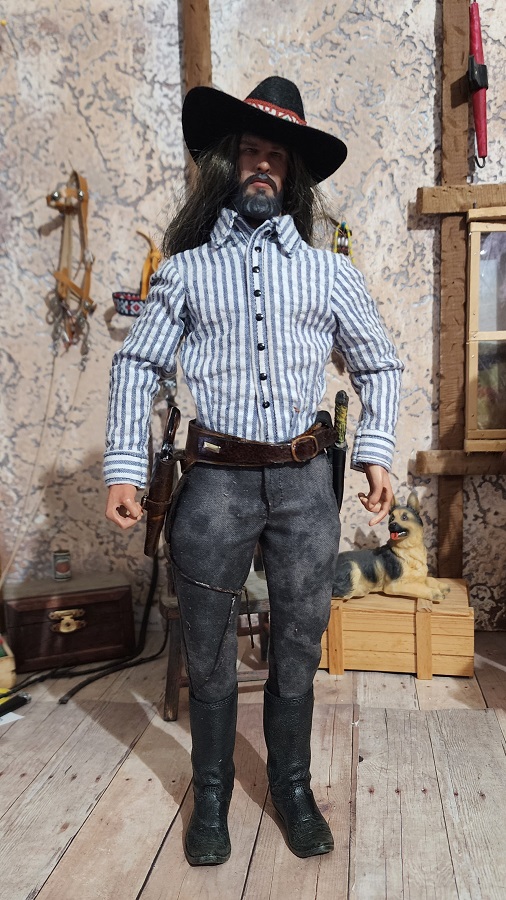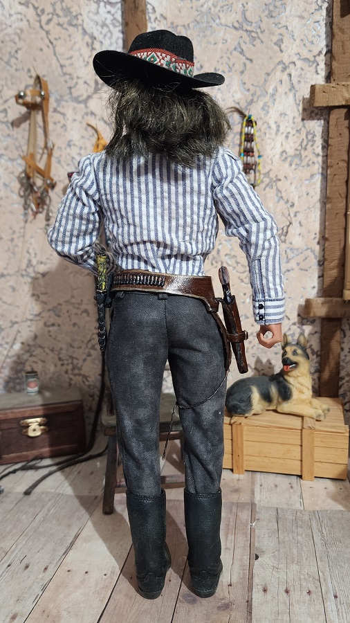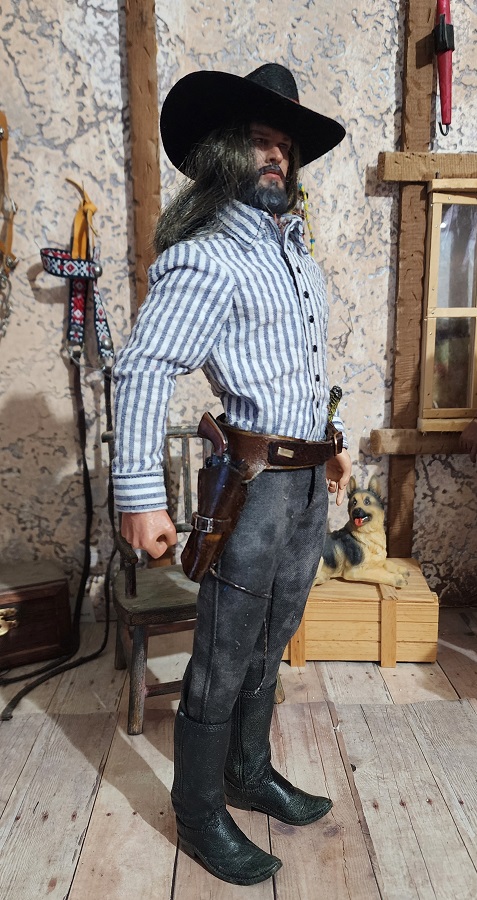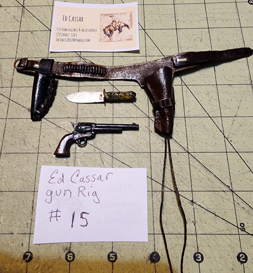 This 1/6 scale gun rig is handmade by Ed Cassar. They are made with real leather and they come with a gun and a hand made knife by Ed as well.