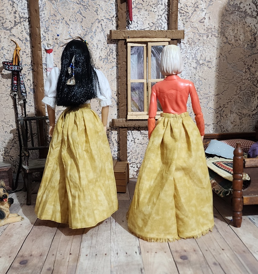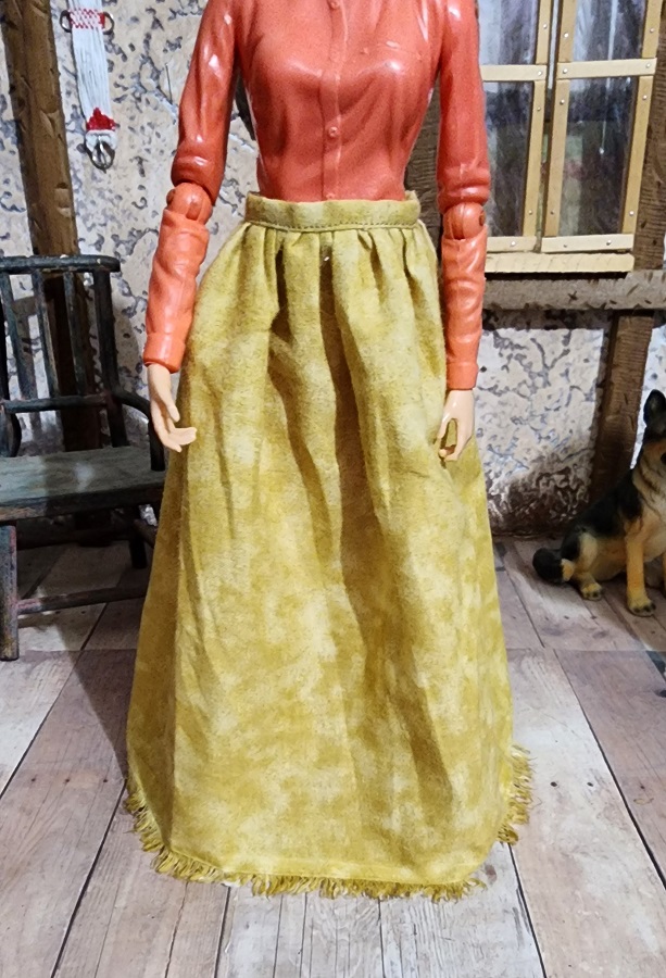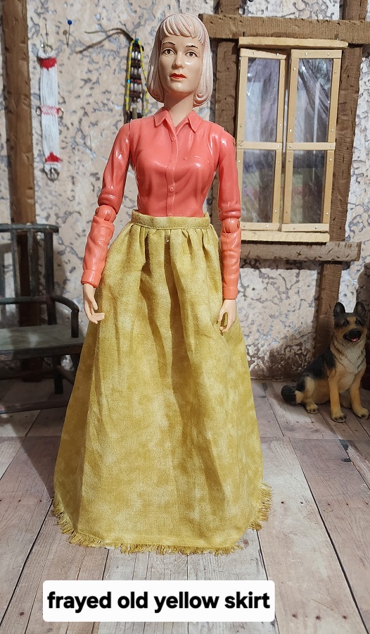 I made 2 styles. One has a hemmed bottom, the other has a frayed bottom. Your choice of 1. They will fit most female figures. The fabric is the same as my old yellow dusters.