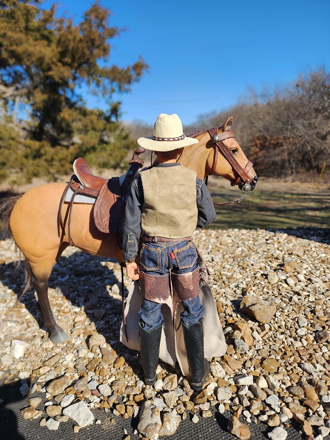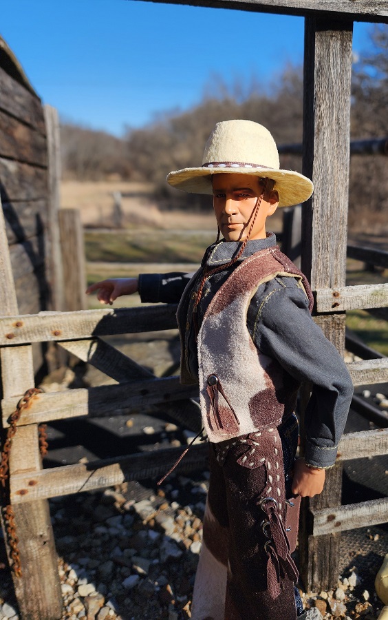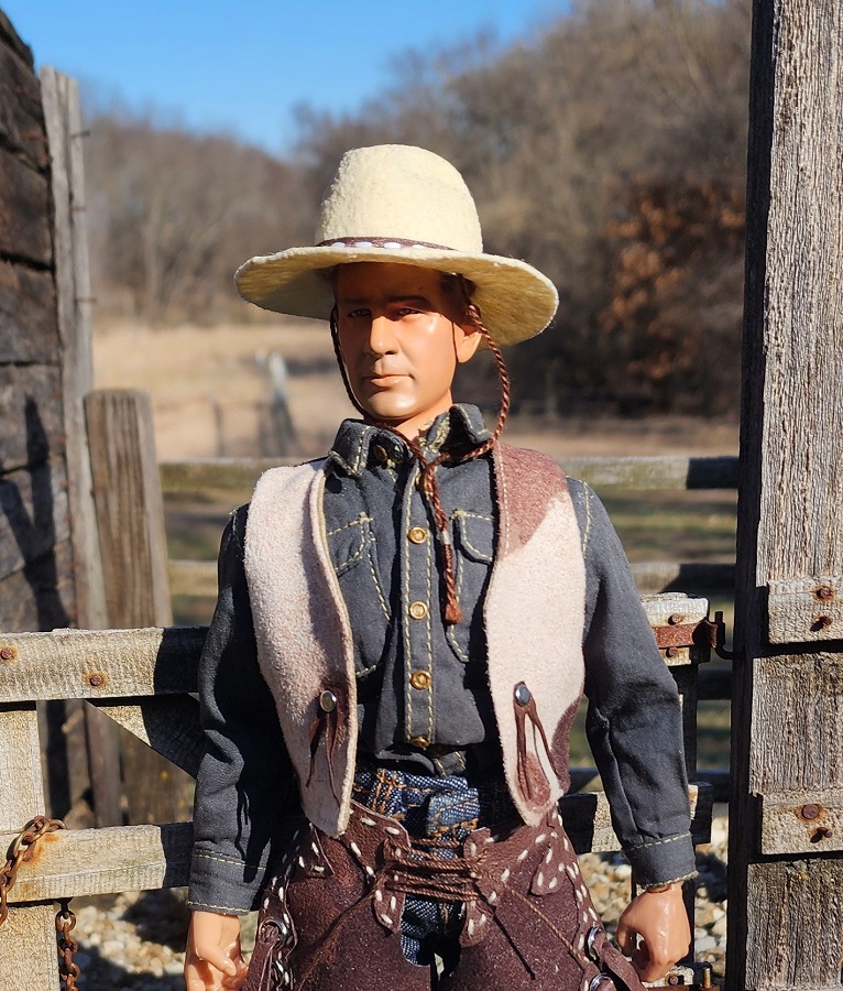 This 1/6 scale vest is made from faux cowhide and reverses to a weathered light brown fabric. It has concho details.