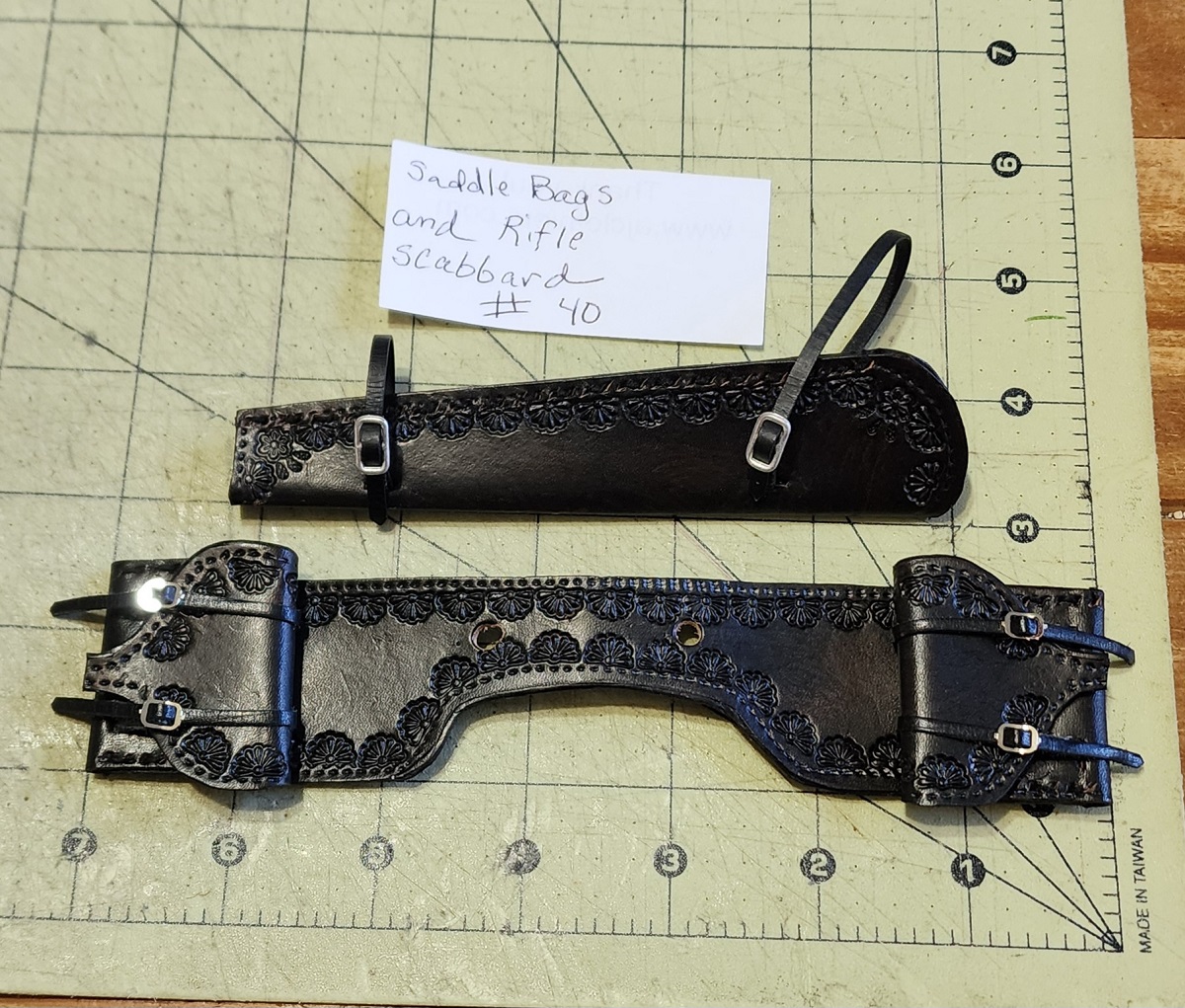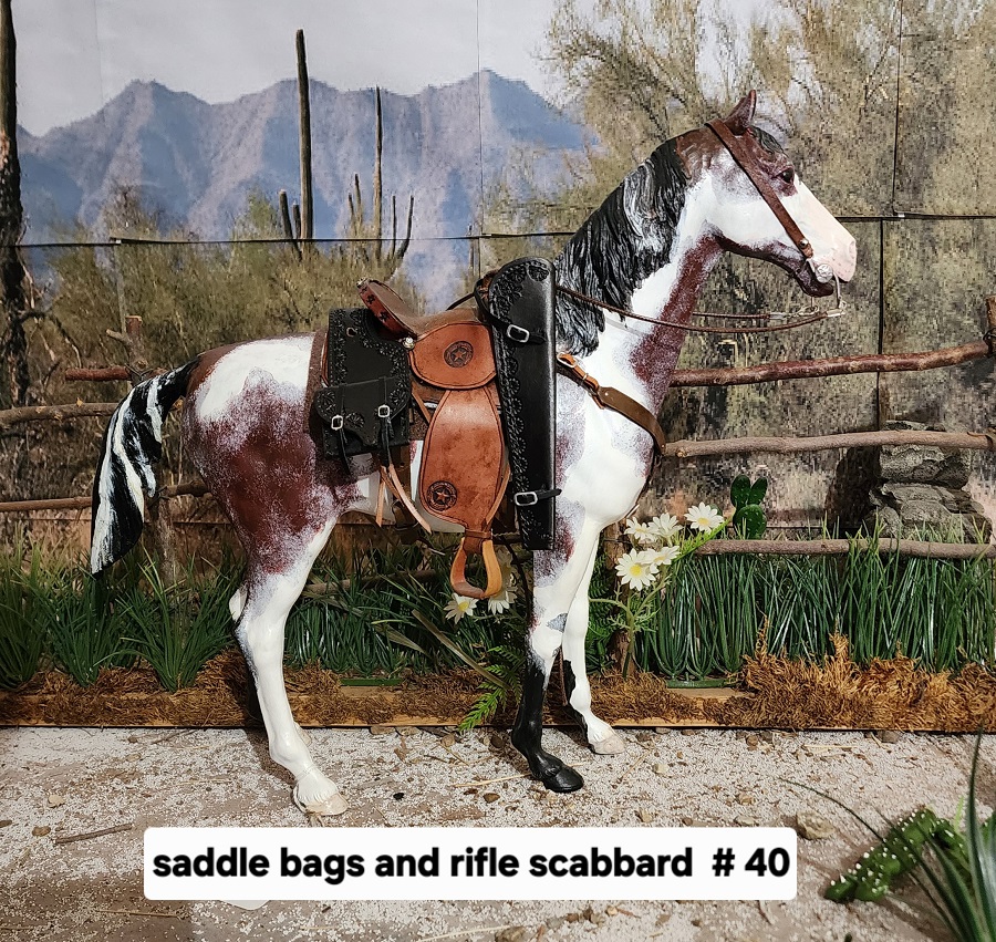 These 1/6 scale saddle bags and matching rifle scabbard are made from real leather. They are hand tooled and dyed a very dark brown, all most black.