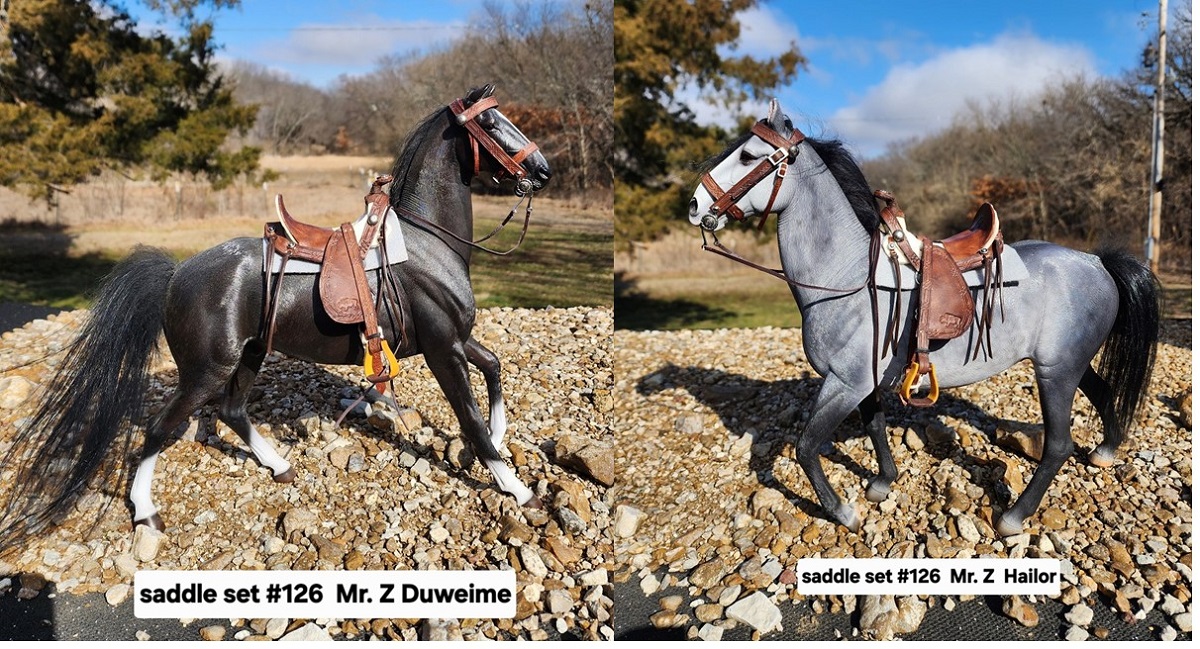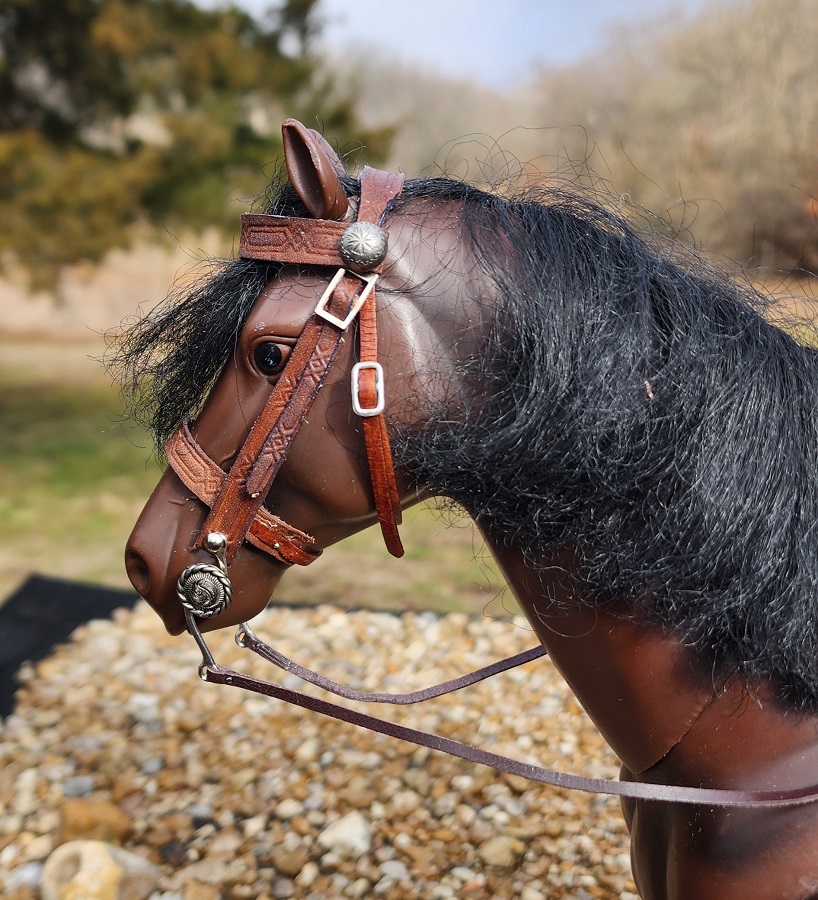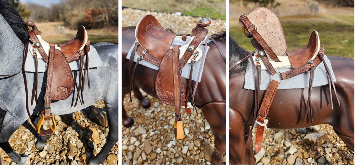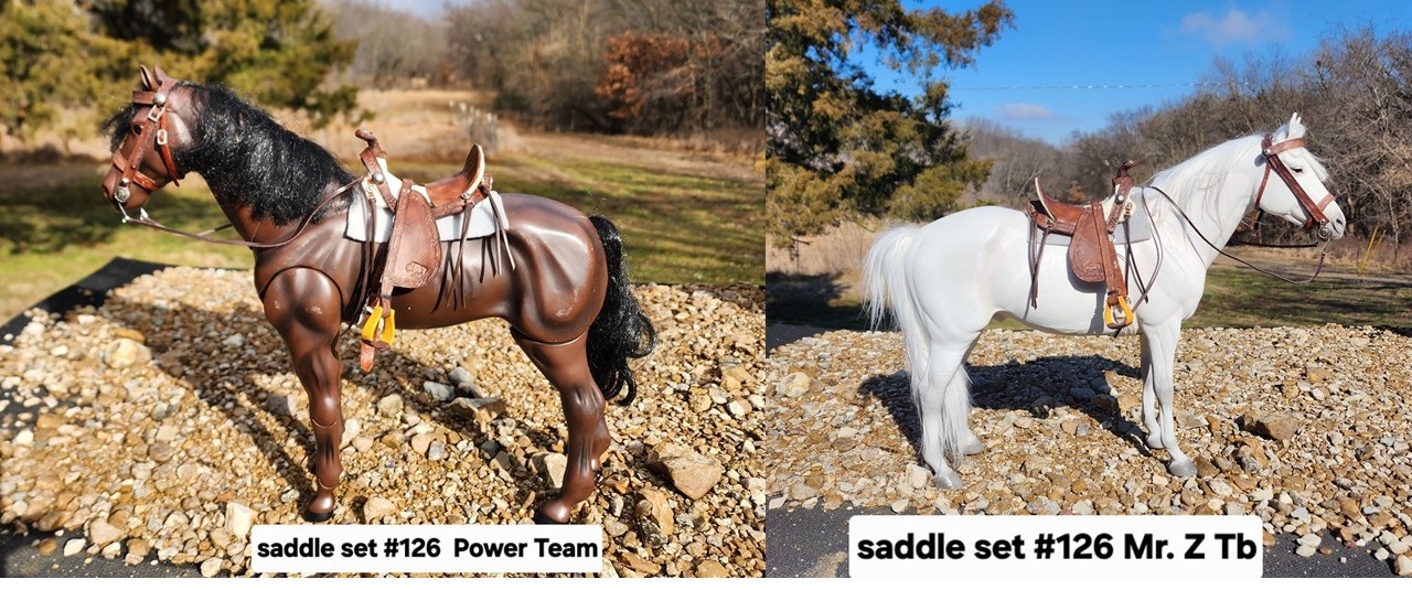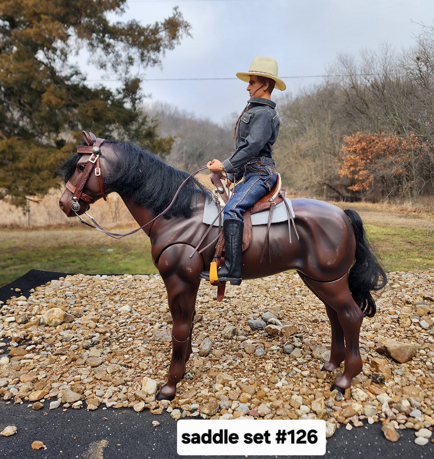 This 1/6 scale Hope style saddle is made with a rawhide tree (made by me), real leather, with a string cinch and bridle. The saddle will fit the larger 1/6 scale model horses like Mr. Z, Power Team, Dragon etc. It is to big for the Johnny West Marx horses.