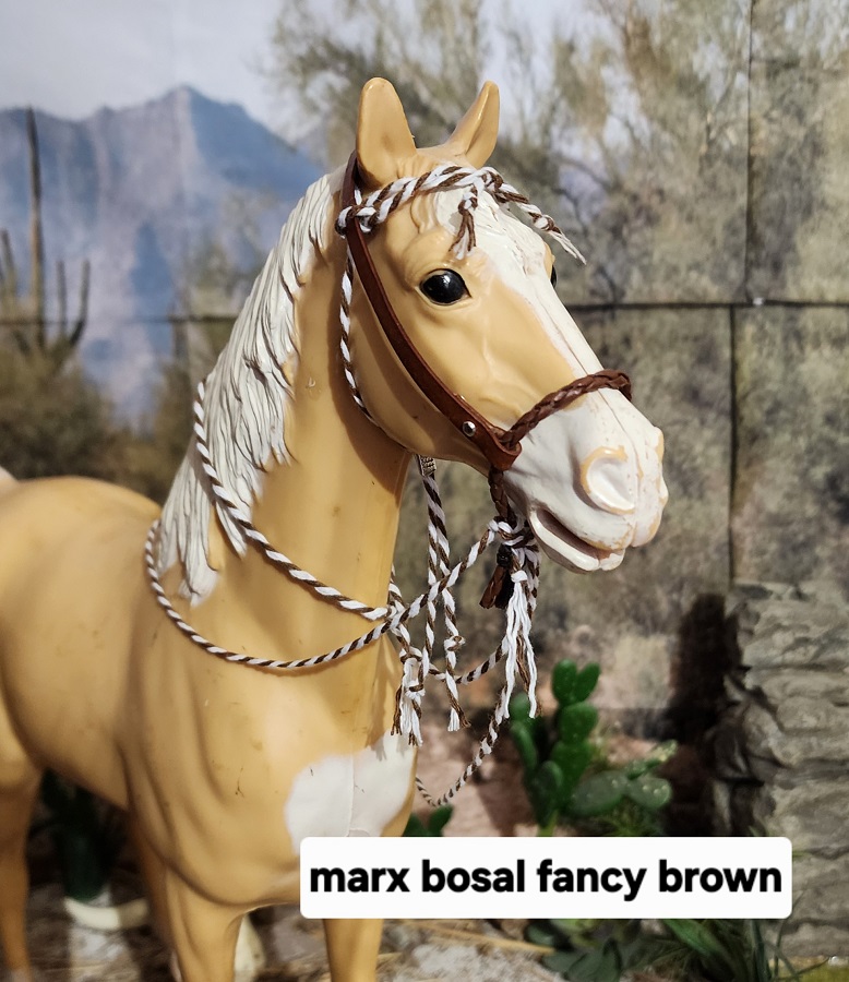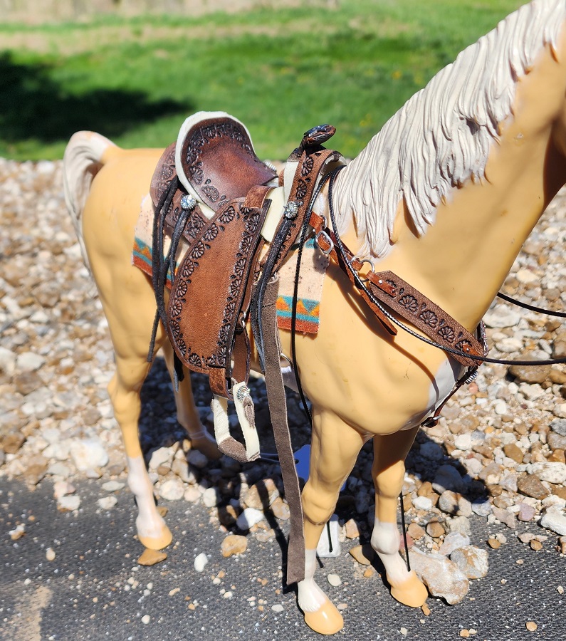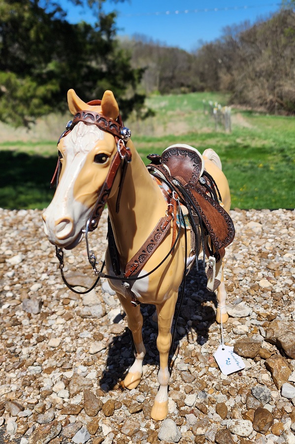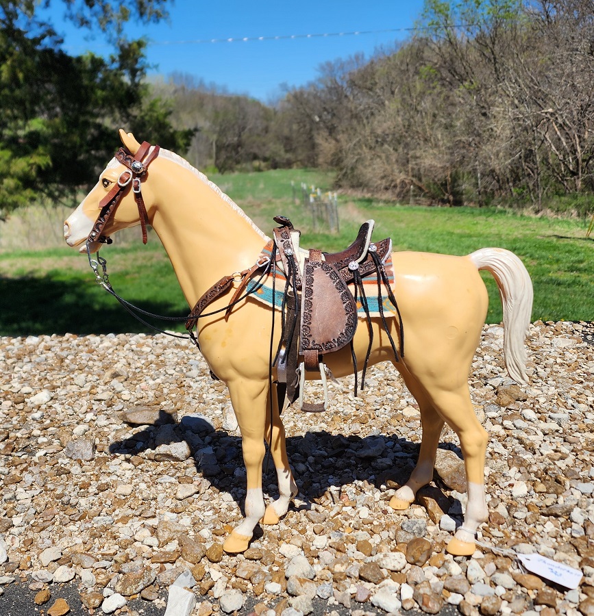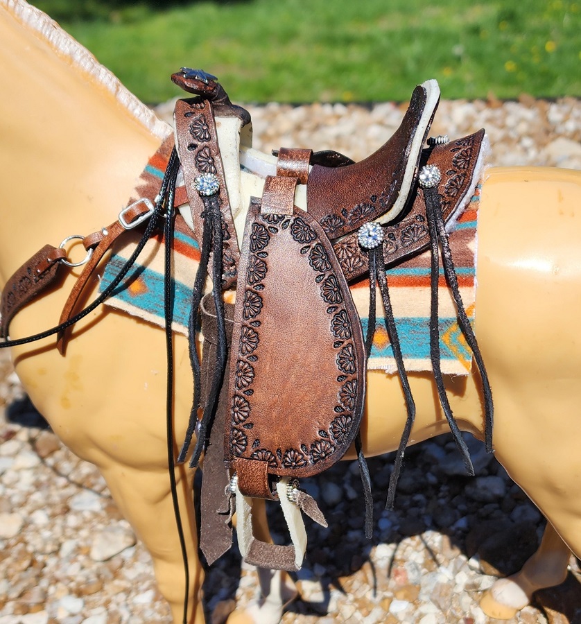 This 1/6 scale saddle set is a Hope style. This set comes with a bitted bridle and a Bosal bridle.