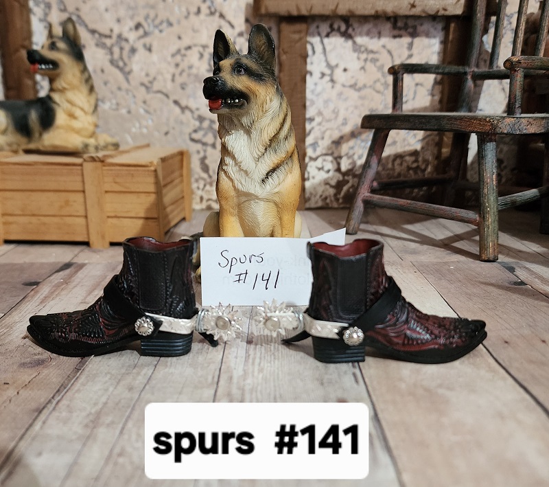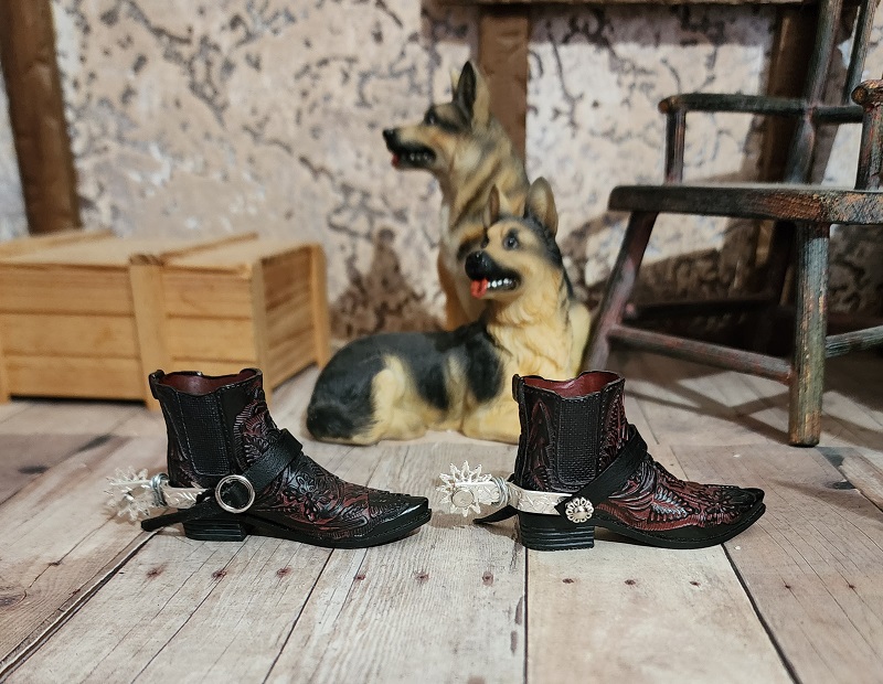 These 1/6 scale spurs are handmade by me. Real leather and metal. This pair have working buckles and the leather has been tooled.