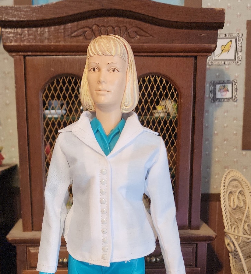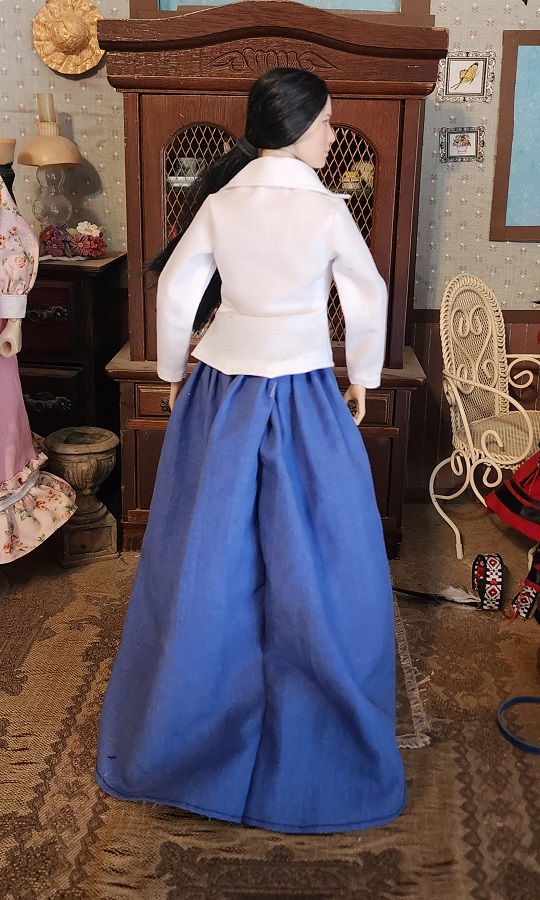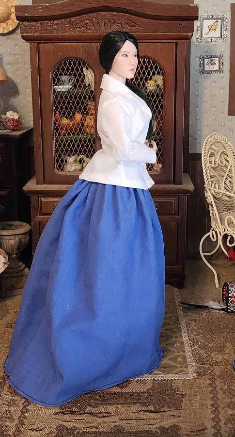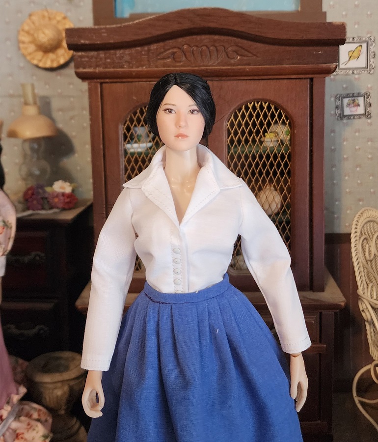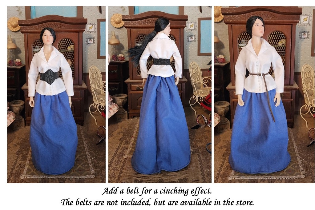 This 1/6 scale ladies blouse is made from a cotton/poly blend fabric. It has a velcro closure in front. It can be worn tucked inside a skirt or left outside a skirt. One photo shows how a belt will change the look of the blouse.